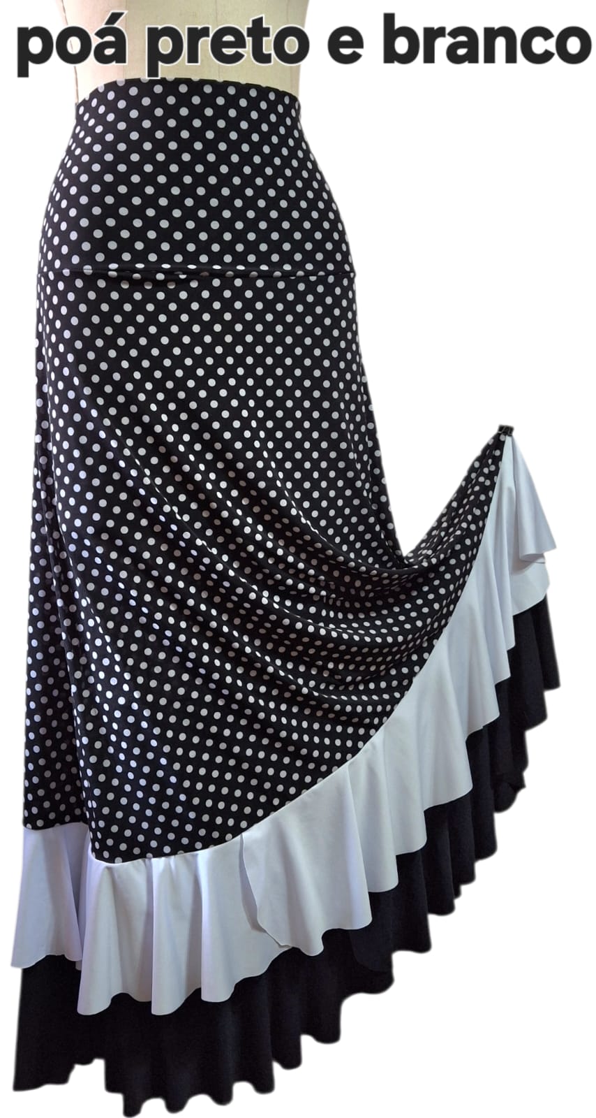 SAIA LONGA EM POÁ MIÚDO COM DOIS BABADOS, UM BRANCO E OUTRO EM PRETO TAMANHO M